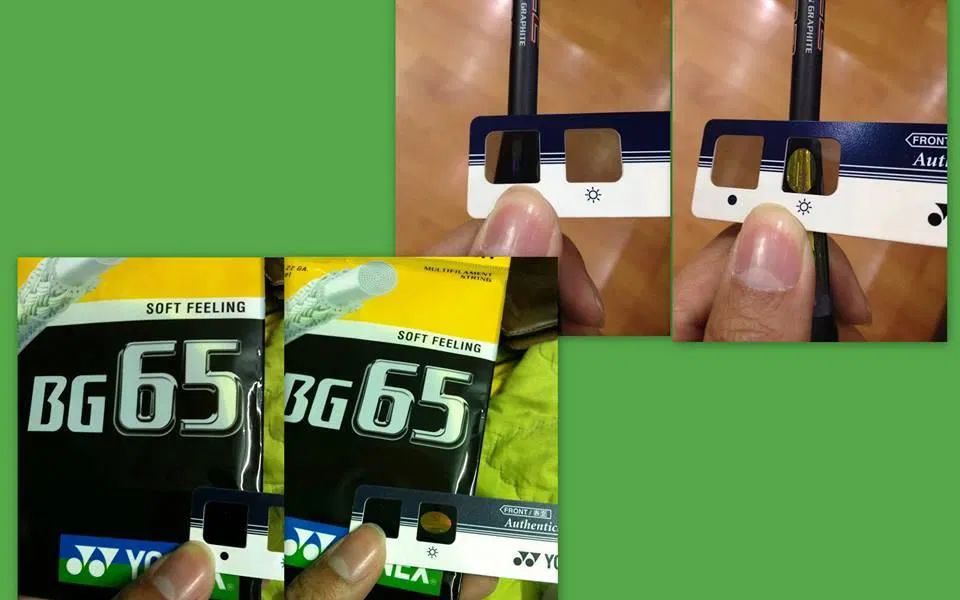 - Miếng kiểm tra này được thiết kế với hai ô: khi đặt vào ô tối, tem thật sẽ biến mất hoàn toàn, trong khi ô sáng sẽ hiển thị hình ảnh. Ngược lại, tem giả sẽ luôn phát sáng ở cả hai ô. Đặc biệt, đối với tem thật với vệt 7 màu mới, ô tối sẽ hiện rõ vệt 7 màu cùng dòng chữ Yonex, còn ô sáng sẽ tỏa sáng với các chữ Yonex nhỏ.