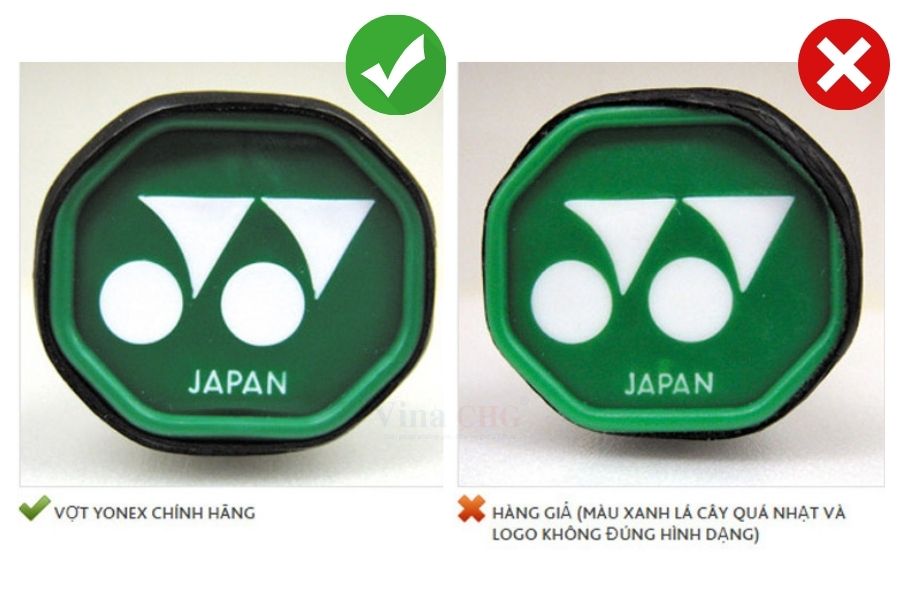 - Ở phần nắp đế vợt, chúng ta có thể dựa vào màu sắc của nắp để phân biệt vợt Yonex thật giả, thường sản phẩm chính hãng sẽ có màu sắc sắc nét, được làm bằng nhựa cao cấp đem lại cảm giác chắc chắn, Logo, chữ in rõ nét, sắc sảo, không bị mờ nhòe, được làm vừa vặn với cán vợt.