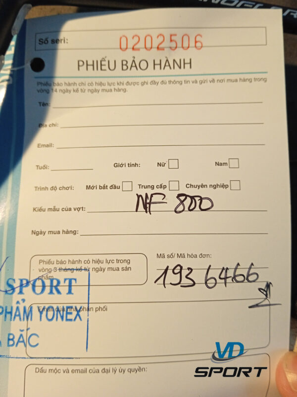 - Với các dòng vợt cầu lông của Yonex, sản phẩm sẽ được kèm theo một phiếu bảo hành riêng biệt. Trên phiếu bảo hành, bạn sẽ tìm thấy mã số series, và điều đặc biệt là mã số này phải được khắc trên vợt và hoàn toàn trùng khớp với mã số trên phiếu. Bên cạnh đó, phiếu bảo hành cũng sẽ có mộc đỏ của nhà phân phối, cùng với địa chỉ và số điện thoại liên lạc.